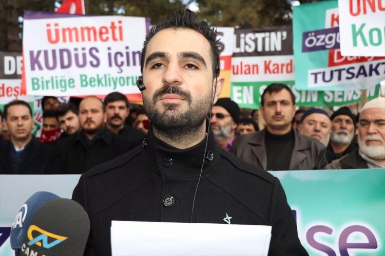 Erzincan'da Camii Kebir önünde bir araya gelen TÜGVA Erzincan İl Temsilciliği üyeleri, ABD Başkanı Donald Trump'ın Kudüs'ü İsrail'in başkenti olarak tanıma ve Amerikan Büyükelçiliğini Tel Aviv'den Kudüs'e taşıma yönündeki planına tepki gösterdi. TÜGVA Teşkilat Başkanı Murat Mermer, basın açıklaması yaptı.