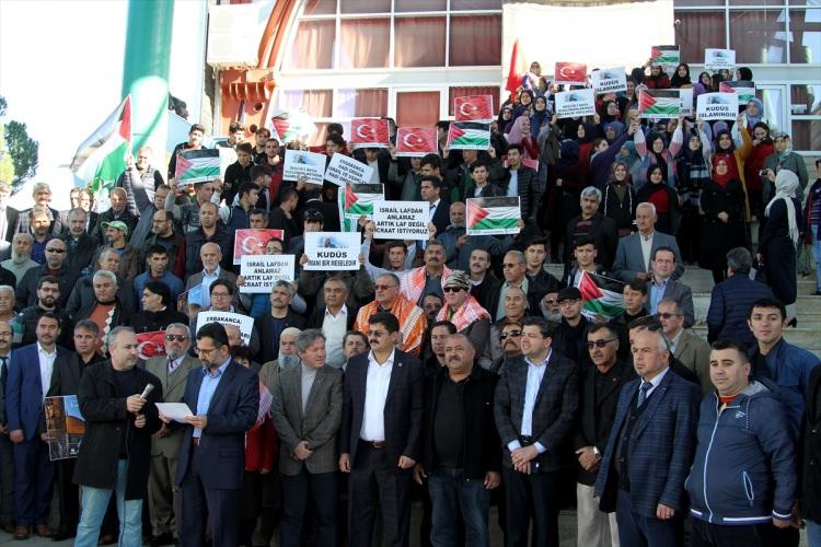 Muğla'nın Fethiye ilçesinde siyasi partiler ve sivil toplum kuruluşu üyeleri, ABD'nin Kudüs'ü İsrail'in başkenti olarak tanımasını Cuma namazı sonrası Beşkaza Meydanı'nda protesto etti.