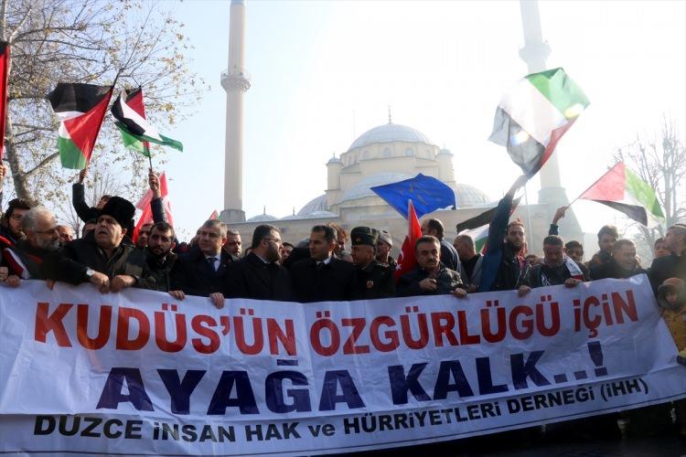 Düzce'de, ABD Başkanı Donald Trump'ın Kudüs'ü İsrail'in başkenti olarak tanıma ve Tel Aviv'deki büyükelçiliklerini Kudüs'e taşıma kararına tepki gösterdi.
