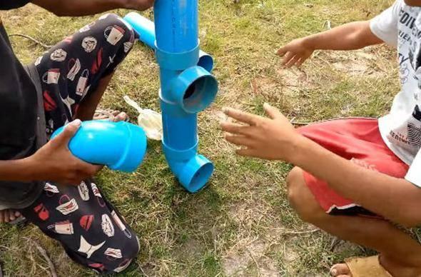 Çocuklar öncelikle PVC boruları T şekli alacak şekilde birleştiriyorlar.