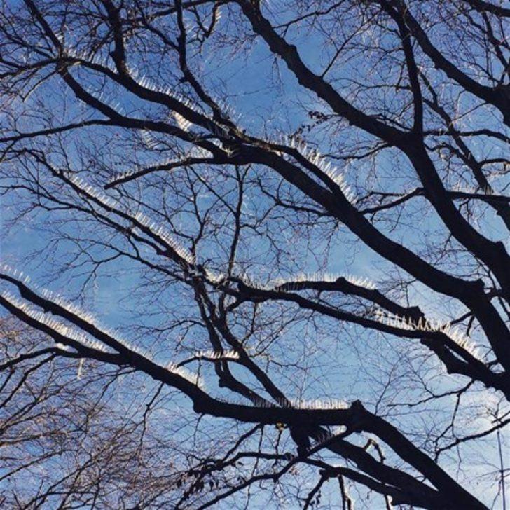 Bir ev sahibi, bahçesindeki otoparkın üzerindeki ağaçlara kuşların konmasını engellemek için ağaçlara kuş engelleyici dikenler monte etmiş.