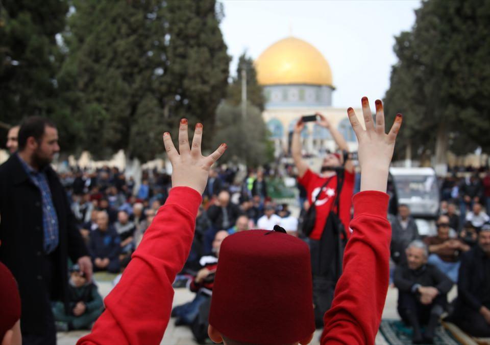 Mescid-i Aksa’da okunan cuma hutbesinin ardından bir grup Filistinli Harem-i Şerif’in avlusunda Kudüs ve Filistin lehine slogan attı.
