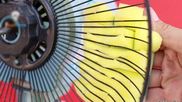 Süngeri şekildeki gibi keserek vantilatör tellerini kolaylıkla silebilirsiniz.