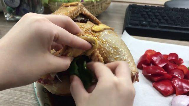 Tavuğun içini doğradığı sebzelerle doldurdu.
