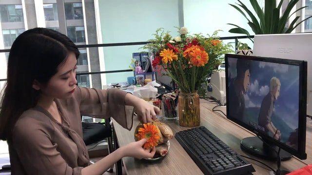 Masasındaki çiçekle son dokunuşu yaptı.