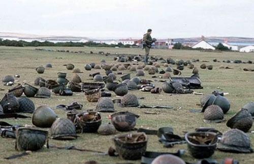 Falkland Adaları'ndaki muharebelerin birinin ardından, Arjantinli askerlerin kasklarını kontrol eden İngiliz askeri, 1982.