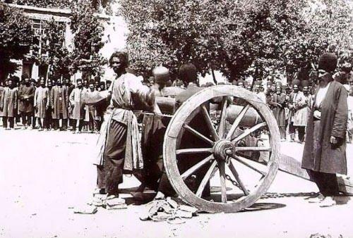 Biraz sonra ateşlenecek bir topun önüne bağlanarak infaz edilmeyi bekleyen İran'lı adam, 19. yüzyılın sonları.