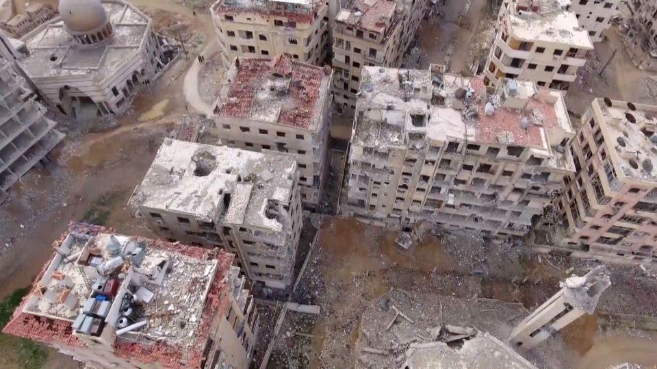 Aynı apartmanın çatısından, savaştan önce oldukça güzel ve düzenli olduğu anlaşılan Duma ilçesinin kuşbakışı manzarası görülüyor.