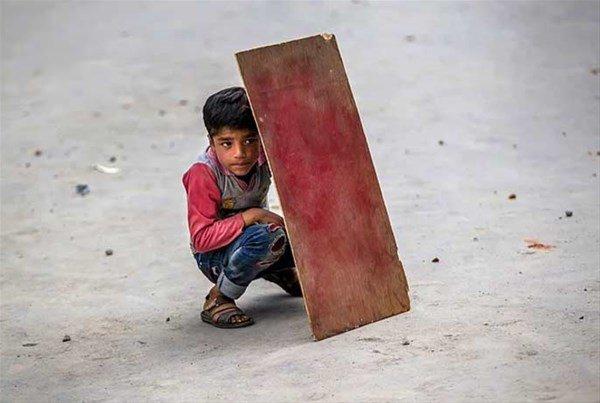 Hindistan'ın Srinagar şehrinde polis ve göstericiler arasında süren çatışmalarda kendini bir suntanın ardında korumaya çalışan çocuk.