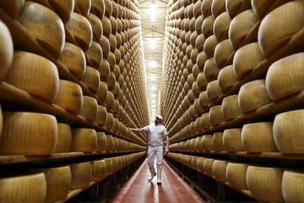 İtalya'nın Montecavolo kentinde bir işçi Credito Emiliano bankasına ait bir depoda tekerlek şeklinde parmesan peynirlerini saklıyor.