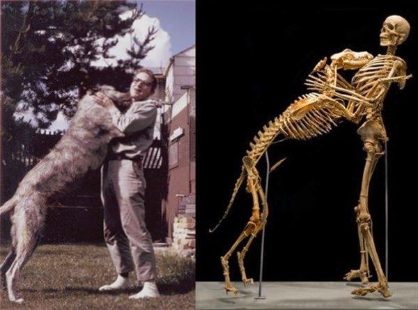 Amerikalı antropolog Grover Krantz ve köpeğinin iskeleti. Ölmeden önce kendisinin ve 3 köpeğinin bedenini bağışladı. Krantz'ın kemikleri, çok sevdiği 72 kilo ağırlığındaki köpeğinin kemikleriyle birlikte, çektirdikleri fotoğrafa uygun olarak birleştirilip müzeye konuldu.