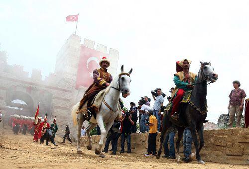 Aynı anda top atışının yapıldığı canlandırmada, temsili yeniçeriler surlara hücum ederek, kentin Osmanlı ordusu tarafından fethedilişini sergiledi.
