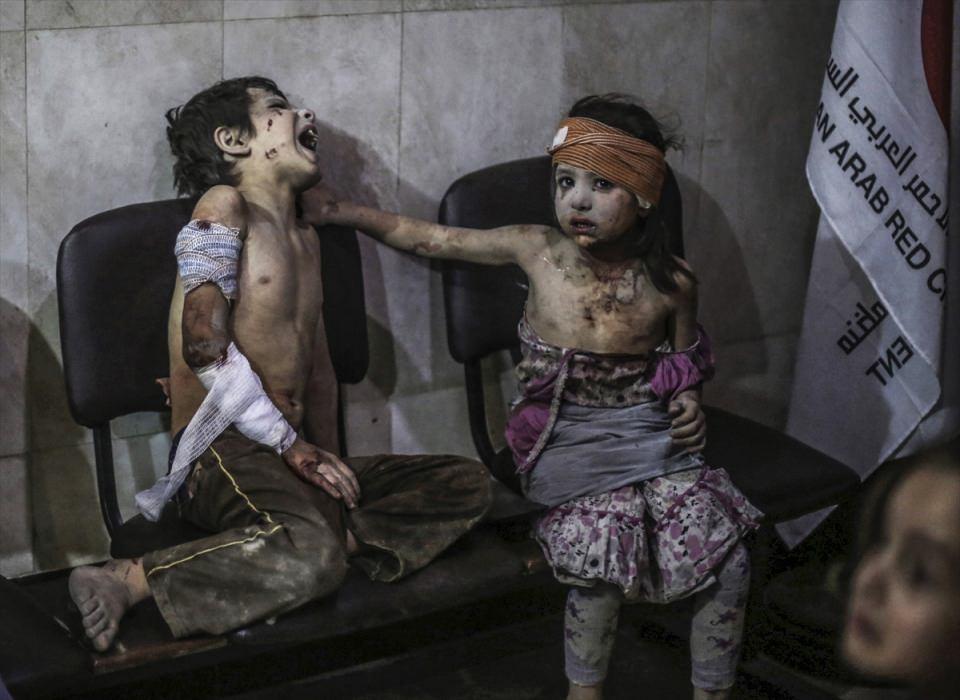 Suriye ordusuna ait savaş uçağının başkent Şam'ın Doğu Guta bölgesinde muhaliflerin denetimindeki Duma'da pazar yerine "vakum bombasıyla" düzenlediği saldırıda çok sayıda kişi hayatını kaybetti. Saldırı sonrası aralarında çocukların da bulunduğu yaralılar, bölgedeki sahra hastanelerinde tedavi için bekledi. (Arşiv)