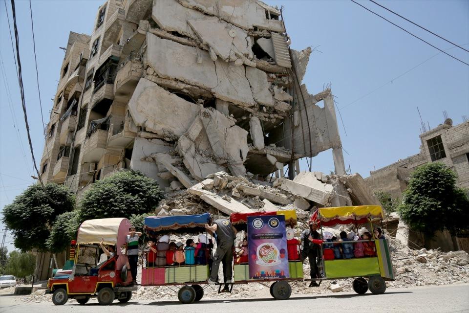 Suriye'nin başkenti Şam'ın Doğu Guta bölgesindeki Arbin ilçesinde, sivil savunma ekipleri çocuklara mesleklerini tanıtmak için bayram etkinliği yaptı. Çocuklara görevlerini tanıtarak güven vermek isteyen ekipler, ilçeye oyun parkı kurdu. Görevliler, çocukları trene bindirerek gezdirdi. (Arşiv)