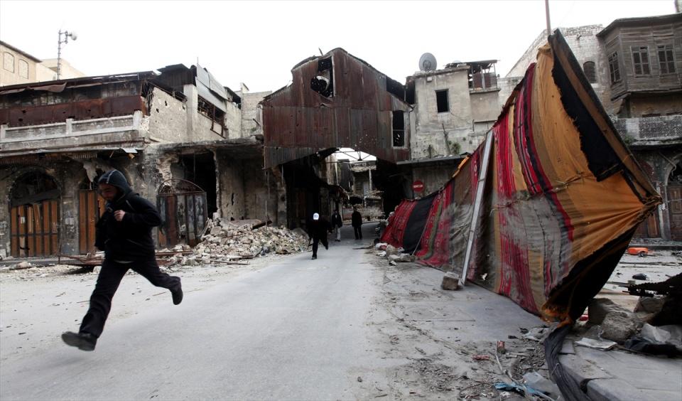 Halep'in Selahaddin Mahallesi'nde kalanlar keskin nişancılara karşı gerilen kumaş parçalarının ardından koşarak geçiyorlar. (Arşiv)