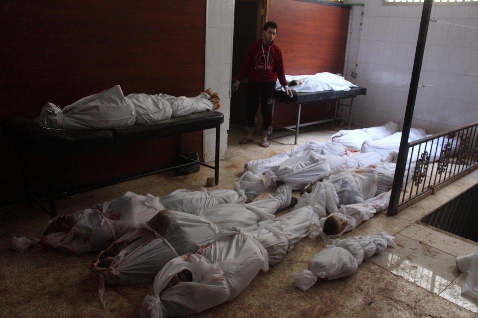 Suriye'deki Esed rejiminin, abluka altında tuttuğu Doğu Guta bölgesine düzenlediği saldırılarda aralarında kadın ve çocukların da olduğu 30 sivil yaşamını yitirdi. Doğu Guta'nın Hamuriye beldesine düzenlenen saldırılar sonucu hayatını kaybedenlerin cenazeleri, çevredeki sahra hastanesinin morguna kaldırıldı. (Arşiv)