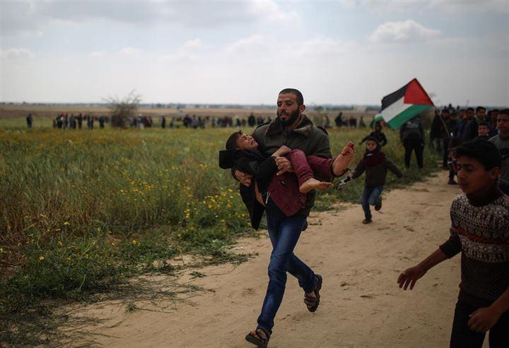 Sınırın diğer tarafındaki İsrail güçlerinin göstericilere müdahale etmesi sonucu yaralanan bir Filistinli, çevredeki vatandaşlar tarafından bölgeden uzaklaştırıldı.