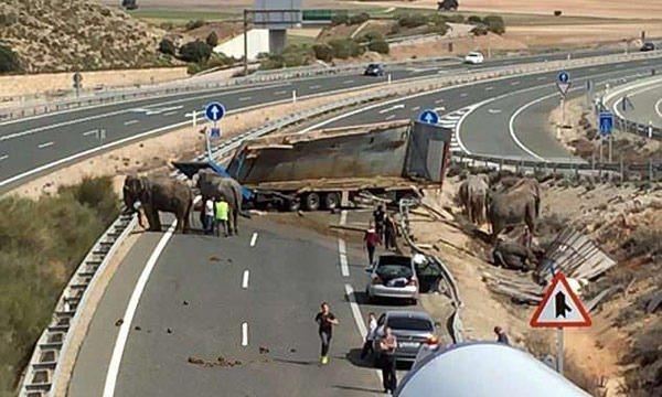 İspanya'nın güneydoğusundaki Albecete yakınlarındaki Pozo Canada kasabasında kaza yapan bir araçtan çıkan beş fil, otoyolda trafiğin durmasına yol açtı.