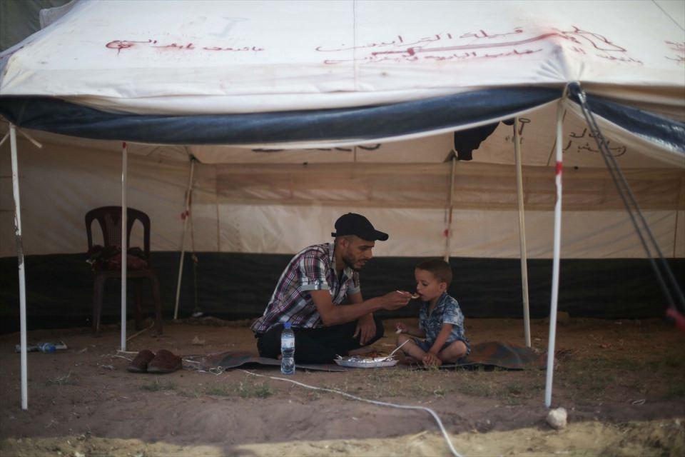 Gazze'nin doğusunda yer alan El Bureyc Mülteci Kampı'ndaki "dönüş kampı" adı verilen bölgede toplanan Filistinliler, ramazan ayının ilk gününü İsrail sınırındaki çadırlarda geçirdi.