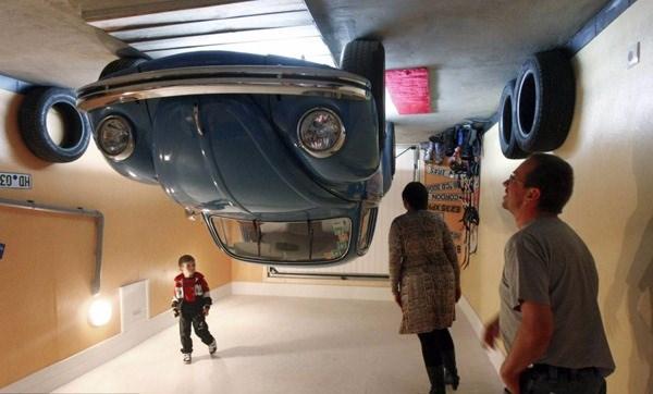 Evin her tarafına yerleştirilmiş eşyalar ters şekilde monte edilirken buna garajdaki otomobil de dahil.