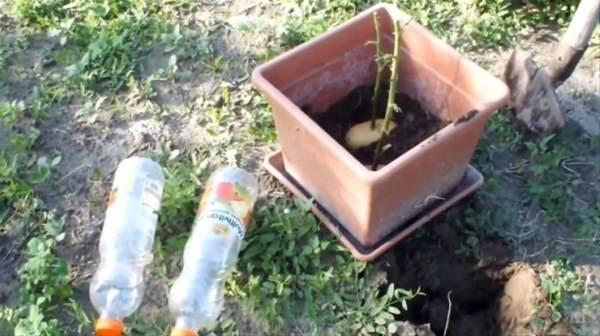 Toprak içerisine gömdüğü gül fidanlarını korumak için iki pet şişeyi keserek üzerlerine kapattı.