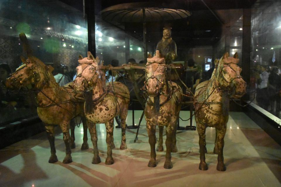 Gerçek askerlere birebir benzetilerek yapılan askerlerin, atları, savaş arabaları ile bronzdan yapılan zırhları, kılıçları, okları, kargıları ve mızrakları mevcut.