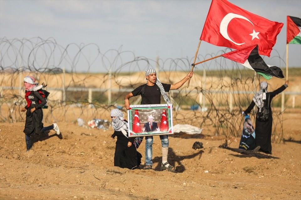 Gazze İsrail sınırında bir grup Filistinli, ellerinde Cumhurbaşkanı Recep Tayyip Erdoğan'ın fotoğrafını ve Türk bayrağını taşıdı.