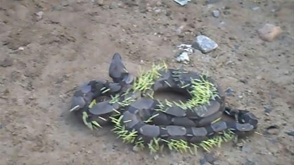 Yeme girişiminde bulunduğu kirpiden ağır bir darbe alan yılan acılar içinde böyle görüntülendi.