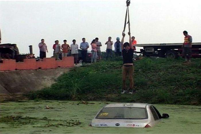 Arama kurtarma ekipleri araç tamamen suya gömülmeden önce genç adamı çekerek kurtardı...