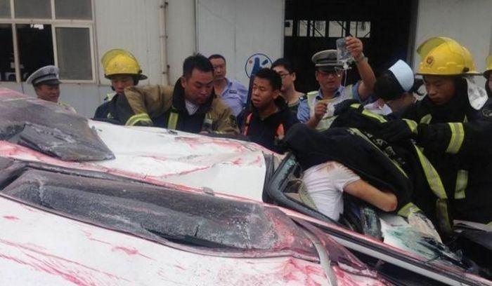 Qingdao yakınlarındaki otoyolda meydana gelen kaza Yaklaşık 100 ton ağırlığındaki konteynerin altında kalan otomobil ezilerek adeta kağıt gibi oldu.
