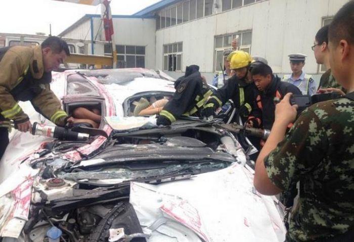 Olay yerine gelen kurtarma ekipleri otomobilden ceset çıkarmayı beklerken, gelen iniltiler üzerine yapılan kurtarma çalışması sonucu bir kadın sadece birkaç sıyrıkla yassı hale gelmiş olan araçtan çıkarıldı.