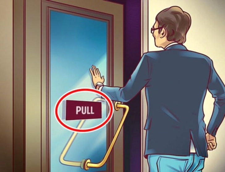 İngilizce 'çekin' yazan kapının itilerek açılması.