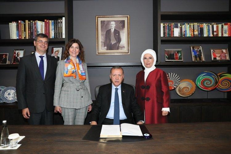 Cumhurbaşkanı Erdoğan ve eşi Emine Erdoğan (sağda), açılıştan sonra Türkiye'nin Pretorya Büyükelçisi Elif Çomoğlu Ülgen'i ziyaret etti.