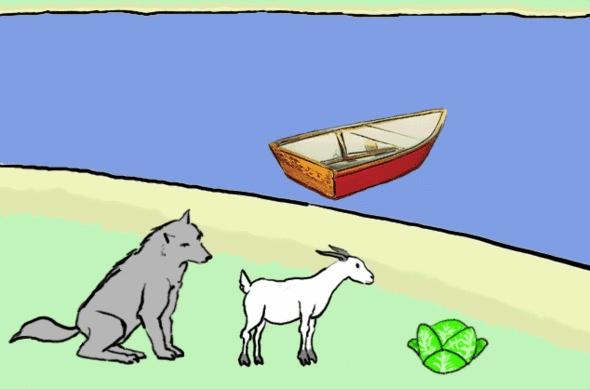 Çiftçi kıyıda bekleyen kurdu bota alırken keçiyi geri bırakır. En son turda ise keçisini yeniden karşı kıyıya taşır.