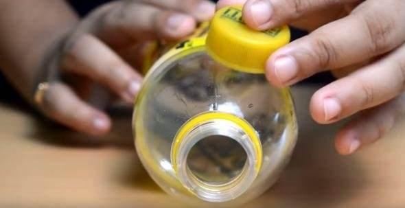 Öncelikle pet şişenin kapağını çıkarıp hemen üst kısmına koyuyoruz.