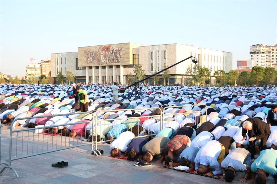 Arnavutluk’un başkenti Tiran’da bulunan İskender Bey meydanında toplanan Müslümanlar, saf tutup geleneksel olarak bayram namazını burada kıldı.