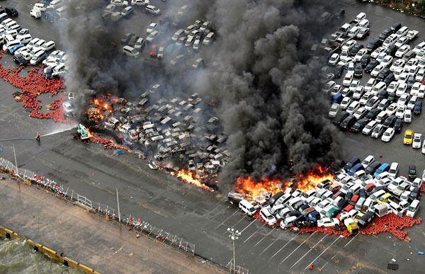 Nishinomiya'daki bir park alanındaki araçlar alev aldı.