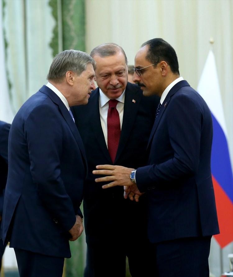 Türkiye Cumhurbaşkanı Recep Tayyip Erdoğan ve Rusya Devlet Başkanı Vladimir Putin'in, "Suriye" meselesi için yapılacak Türkiye-Rusya-İran Üçlü Zirvesi öncesi ikili görüşmesi, İran Liderler Konferans Salonu’nda başladı. Cumhurbaşkanı Erdoğan ile Cumhurbaşkanlığı Sözcüsü İbrahim Kalın (sağda), görüşmenin yapıldığı salonda Rusya Devlet Başkanı Putin'i beklerken, Kremlin Dış Politika Danışmanı Yuriy Uşakov(solda) ile sohbet etti.
