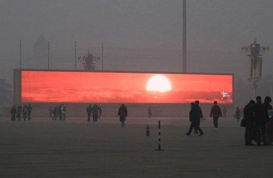 Dünya Sağlık Örgütünün belirlediği maksimum seviyenin bile 25 kat üzerinde bir kirliliğe sahip olan Pekin’de insanlar hem fiziksel hem de psikolojik sağlıklarını yitiriyorlar. Kirlilik öyle bir boyutta ki, otoyollardaki görüş alanı bile birkaç metreye düşüyor. Bunu gören Çin hükümeti hava kirliliğini önlemek yerine Pekin içinde farklı noktalara LCD ekranlar koyarak güneşin doğuşunu veya temiz çevre görüntülerini yayınlıyor.