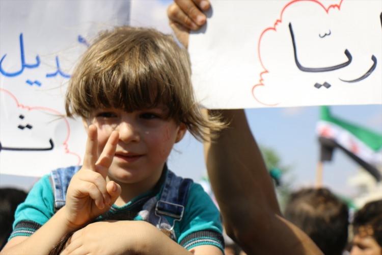 İdlib'in Marratinuman ilçesinde cuma namazı sonrası toplanan göstericiler, ÖSO bayrakları taşıdı.