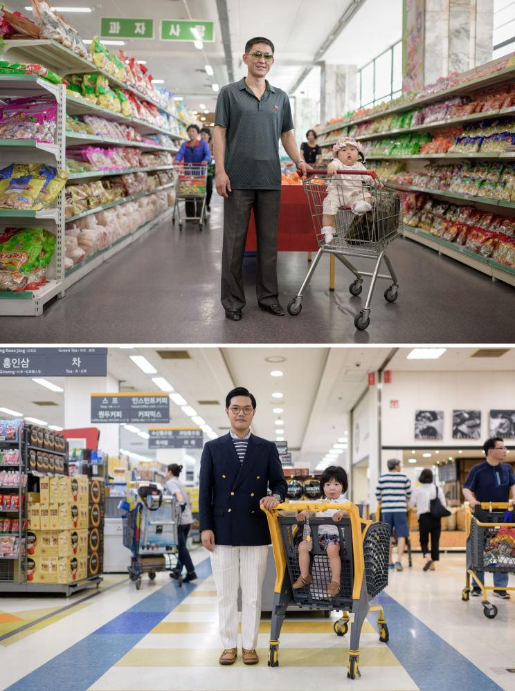 Kuzey Koreli Han Gwang Rim kızı Su Ryon ile Pyongyang'daki markette (yukarıda) ve Güney KoreliHong Sung-cho oğlu Hong Jinu ile başkent Seul'daki markette (aşağıda)