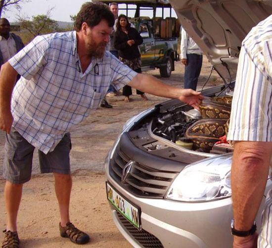 Çift, bir turist grubunun yanında araçlarını durdurarak etraftakilerin yardımıyla ,hiç çıkmak istemese de, yılanı yerinden almayı başardı.