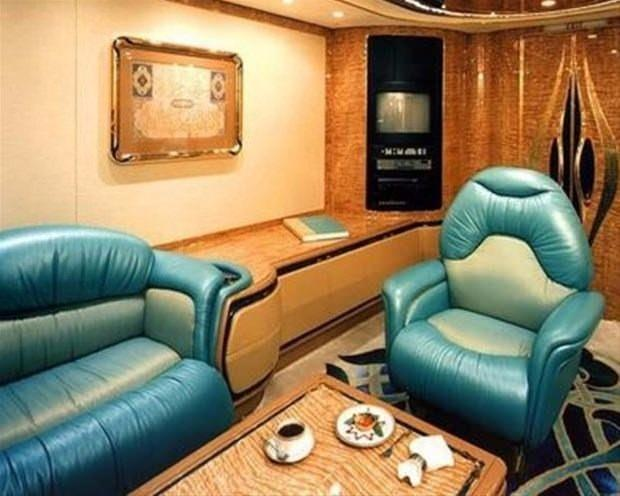 Oturma odası, yatak odası ve banyonun tamamı altın ve Lalique kristalinden dekore edilmiştir.