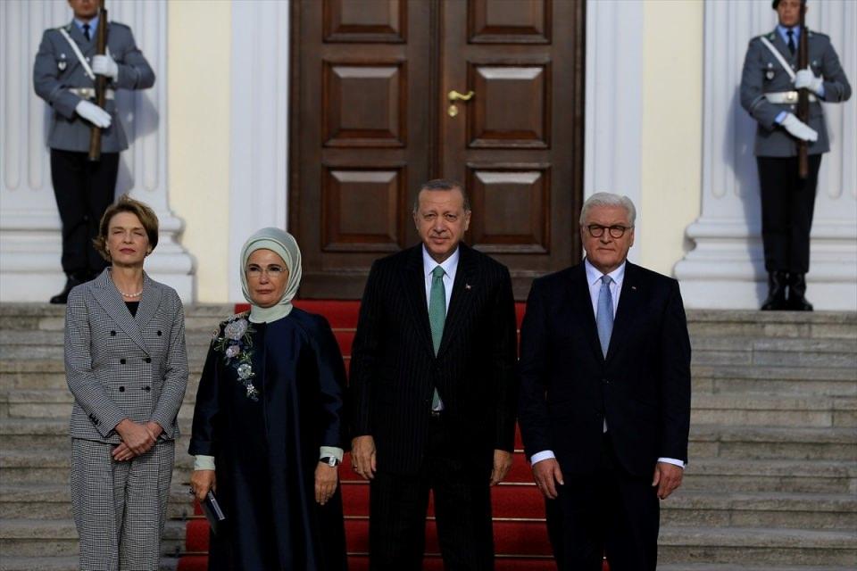 Cumhurbaşkanı Erdoğan ve eşi Emine Erdoğan, Bellevue Sarayı'nın önünde Steinmeir ve eşi Elke Buedenbender'le.