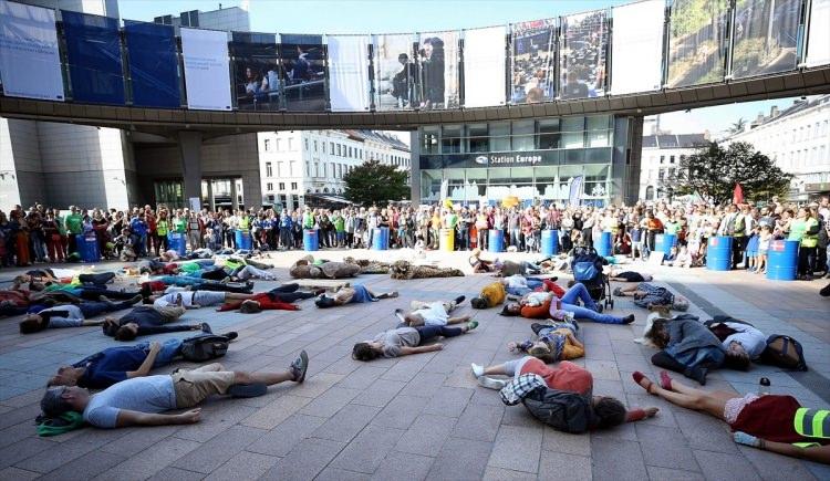 Belçika'nın başkenti Brüksel'deki Avrupa Parlamentosu (AP) önünde toplanan yüzlerce çevreci, küresel ısınma ve iklim değişikliklerine dikkat çekmek için gösteri yaptı.