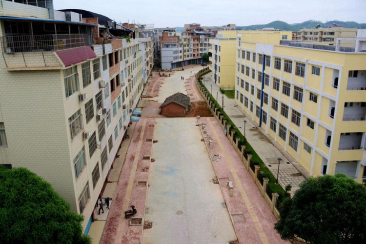 Çin’in Nanning kentinde bir ev sahibi, bölgede inşaat yapan firmayla anlaşamadığı için evini terketmeyi reddediyor.