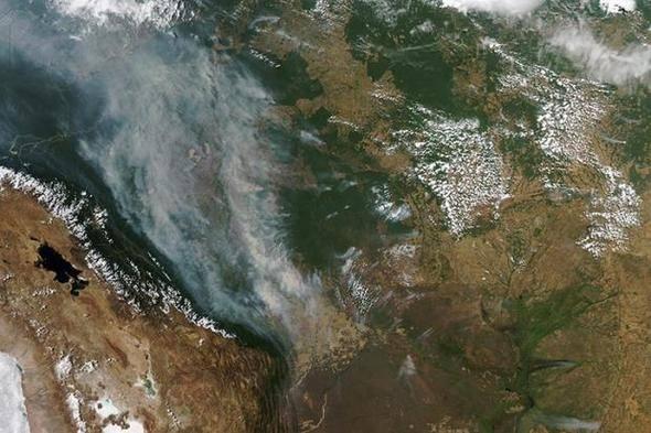 Bolivya’da Eylül 2011’de meydana gelen yangının uzaydan çekilen görüntüsü. Fotorafta, kırmızı hatlı çizgiler yangından dolayı oluşan yüksek sıcaklıkların olduğu yerleri gösteriyor. Alevlerin neden olduğu duman karayı kapladığından, bu bölgeler uyduların görüşünden çıkmış durumda. Duman bulutları batıdan, kuzey batıya doğru esiyor. Bolivya’da doğal nedenlerden çok sayıda yangın yaşansa da, fotoğraftaki gibi geniş alanlara yayılan alevler çalı çırpıları yakmak amacıyla çıkartılan tarımsal bir yangını gösteriyor