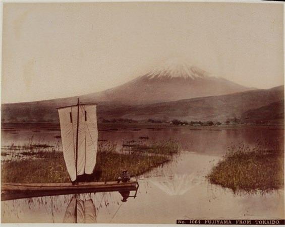 Fuji Dağı manzarasında yelkenlisiyle açılan Japon adam, 1890'lar.
