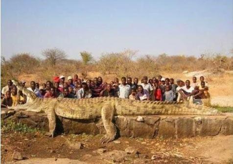 9.5 metrelik timsah ve önünde poz veren insanlar.