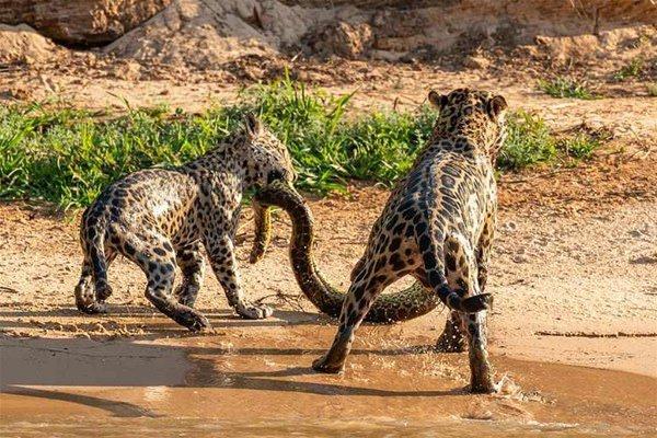 Anne jaguar ve yavrusu suda avladıkları yaklaşık 5 metrelik bir anakonda avladılar.